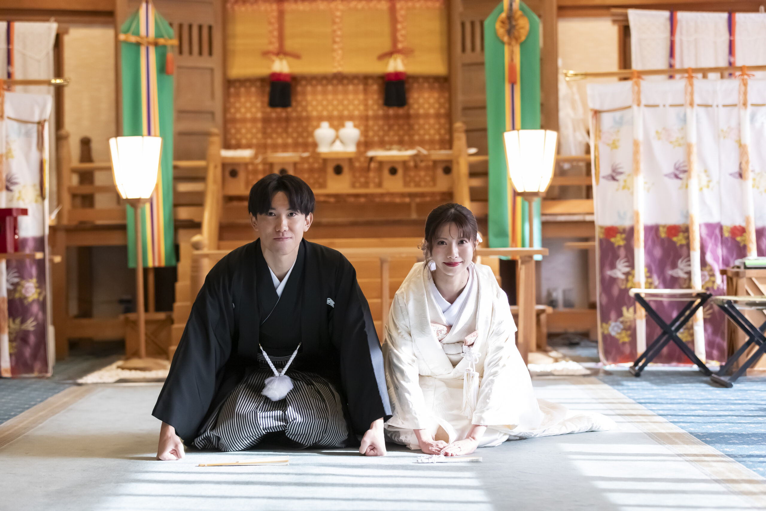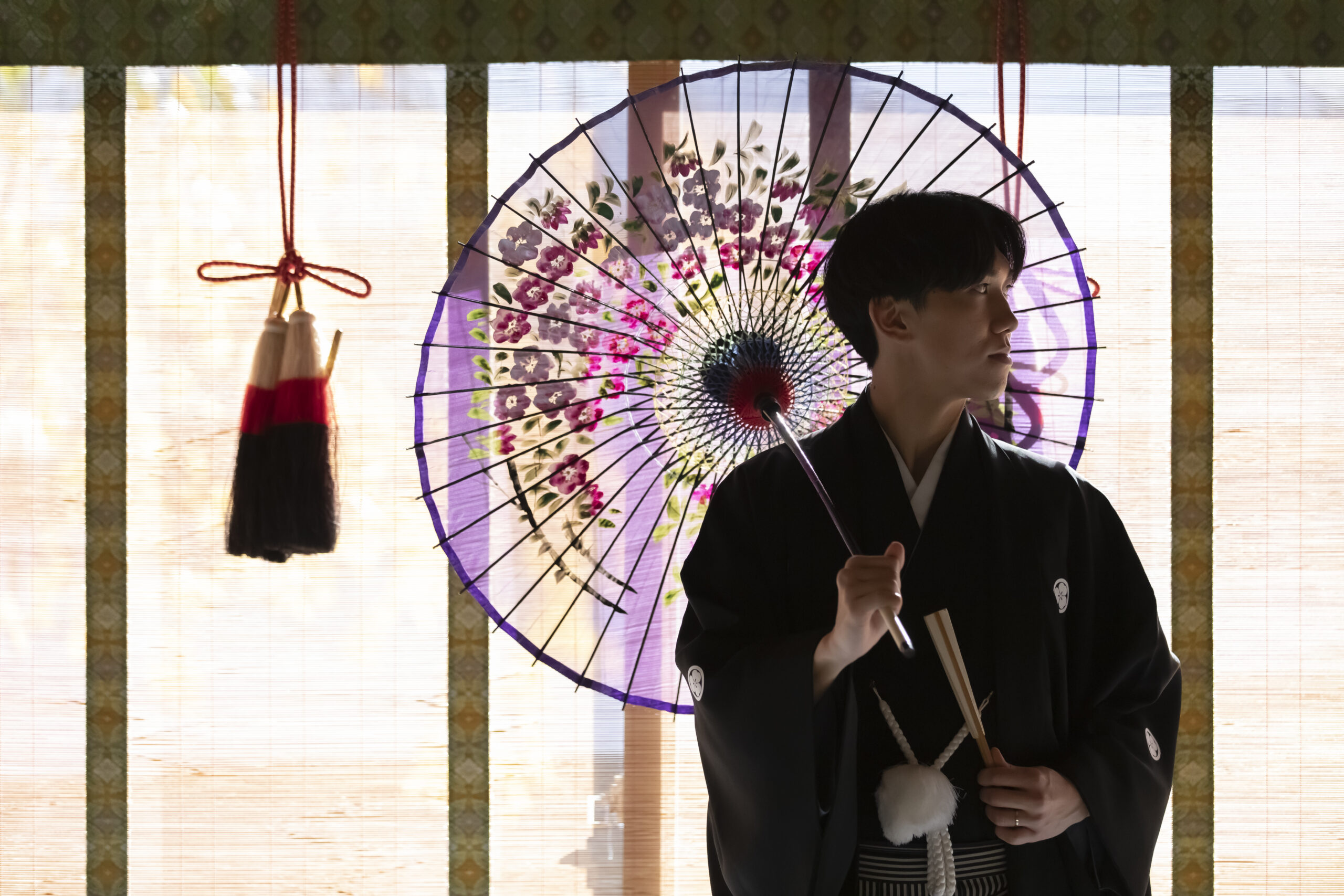 自然光差し込む独立型神殿に柔らかな光を受けて広がる番傘の陰影。 和の美しさをそっと包み込むように ご新郎様の姿をより優雅に引き立ててくれます。